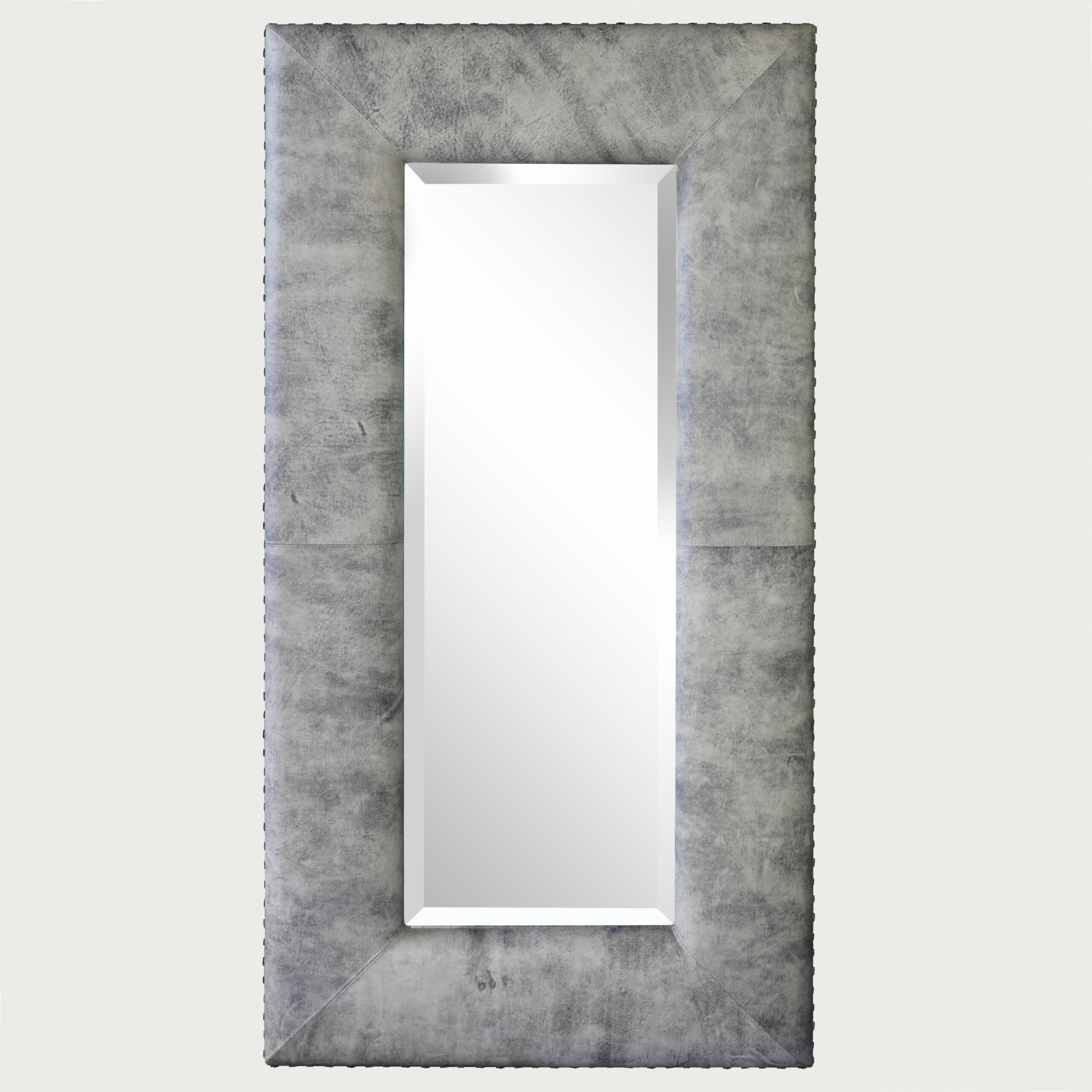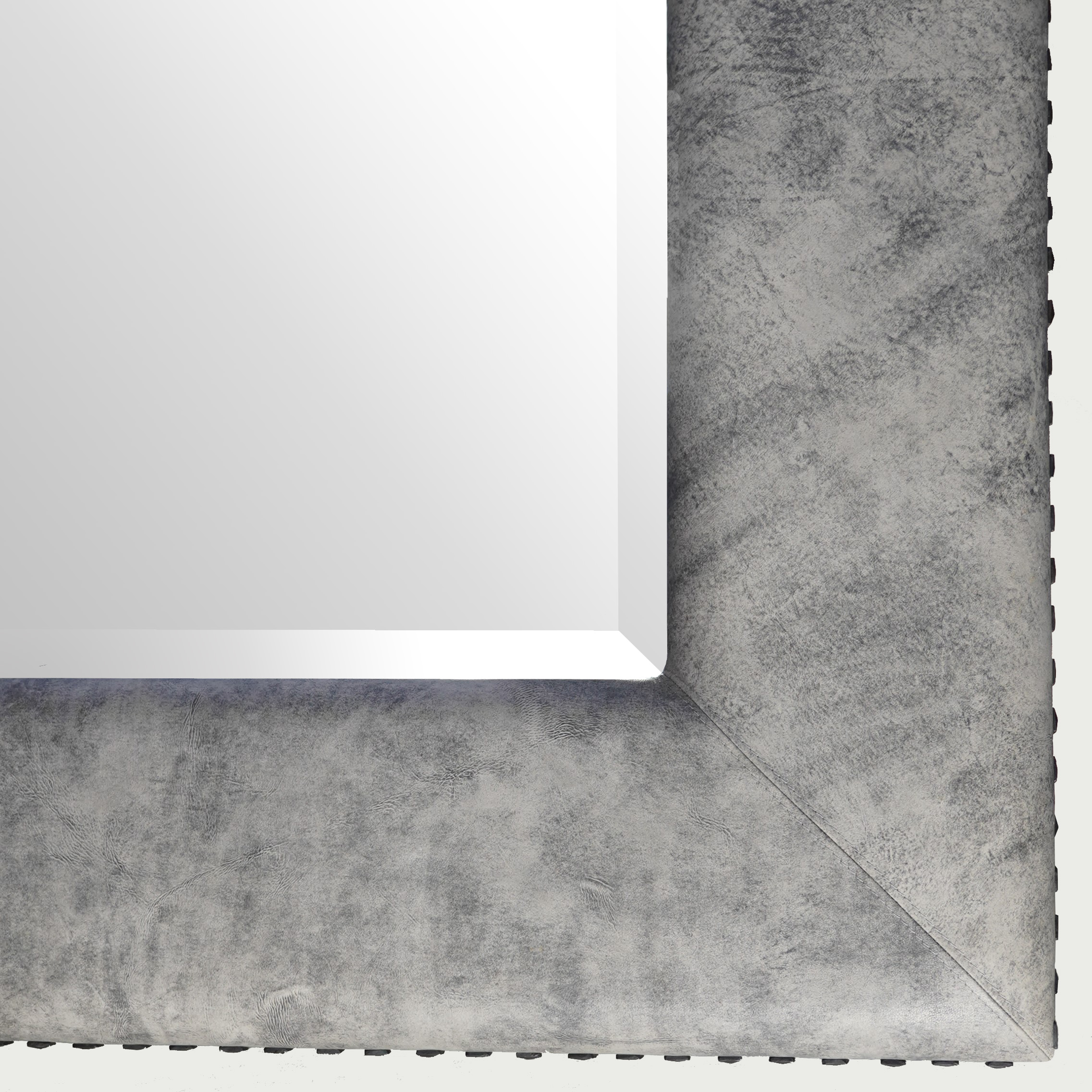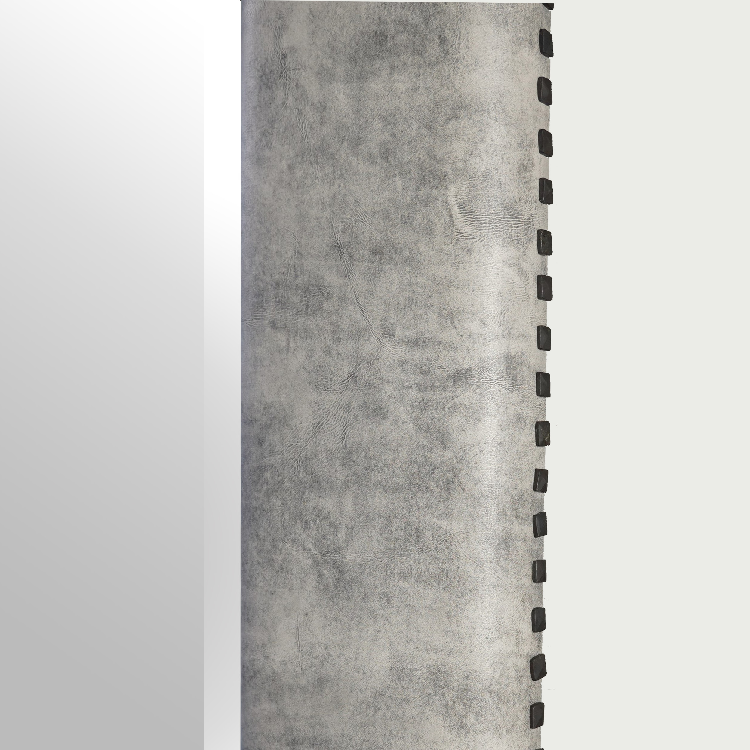 Bij deze lijst zitten de handgemaakte siernagels niet zoals bij machinaal gemaakte siernagels recht onder elkaar omdat de steeltjes niet recht zijn. Maar juist deze siernagels samen met het geschaafde leer maken deze spiegel super cool! Deze lijst is tevens verkrijgbaar in diverse modellen machinaal gemaakte siernagels. De vanafprijs is dan inclusief spiegelglas met facetgeslepen rand: 1903,-. Neem hiervoor contact met ons op.